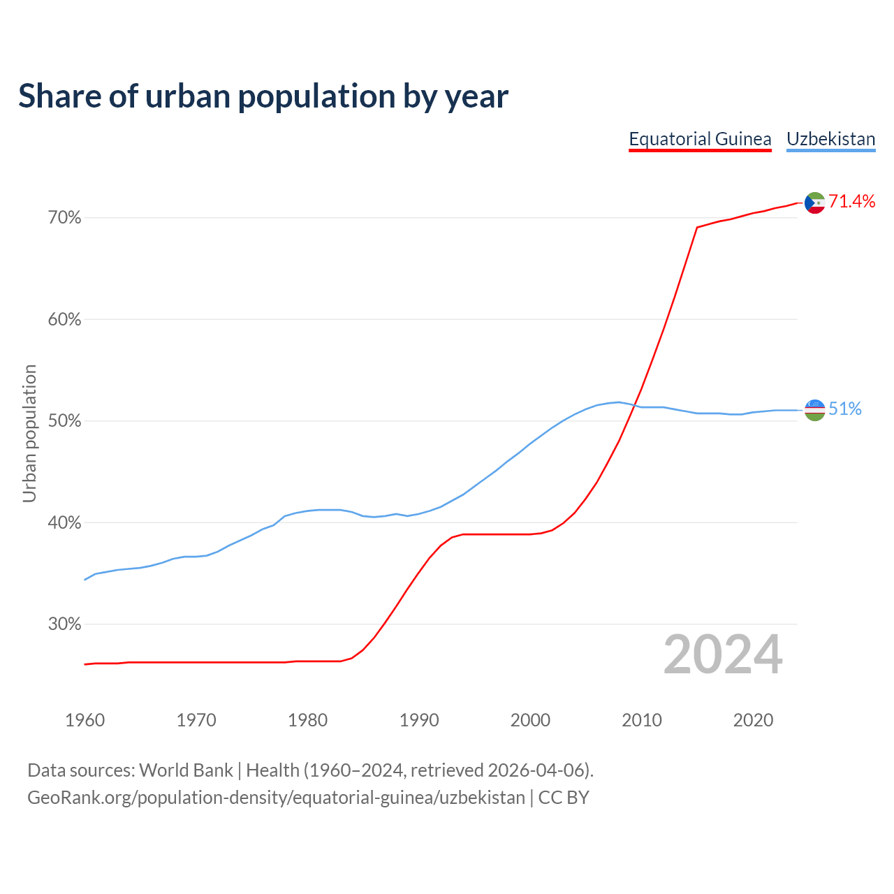 From 2004 to 2024, the share of urban population changed from 40.9% to 71.4% in Equatorial Guinea and from 50.6% to 51% in Uzbekistan.