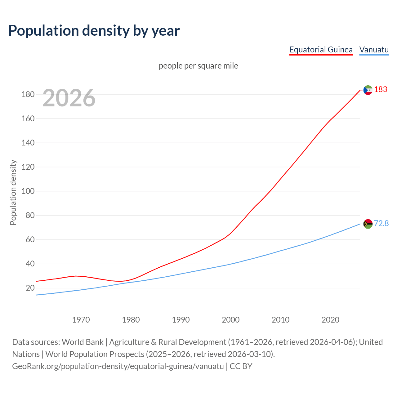 From 2006 to 2026, population density in Equatorial Guinea increased by 100.5%, compared to a 58.7% growth in Vanuatu.