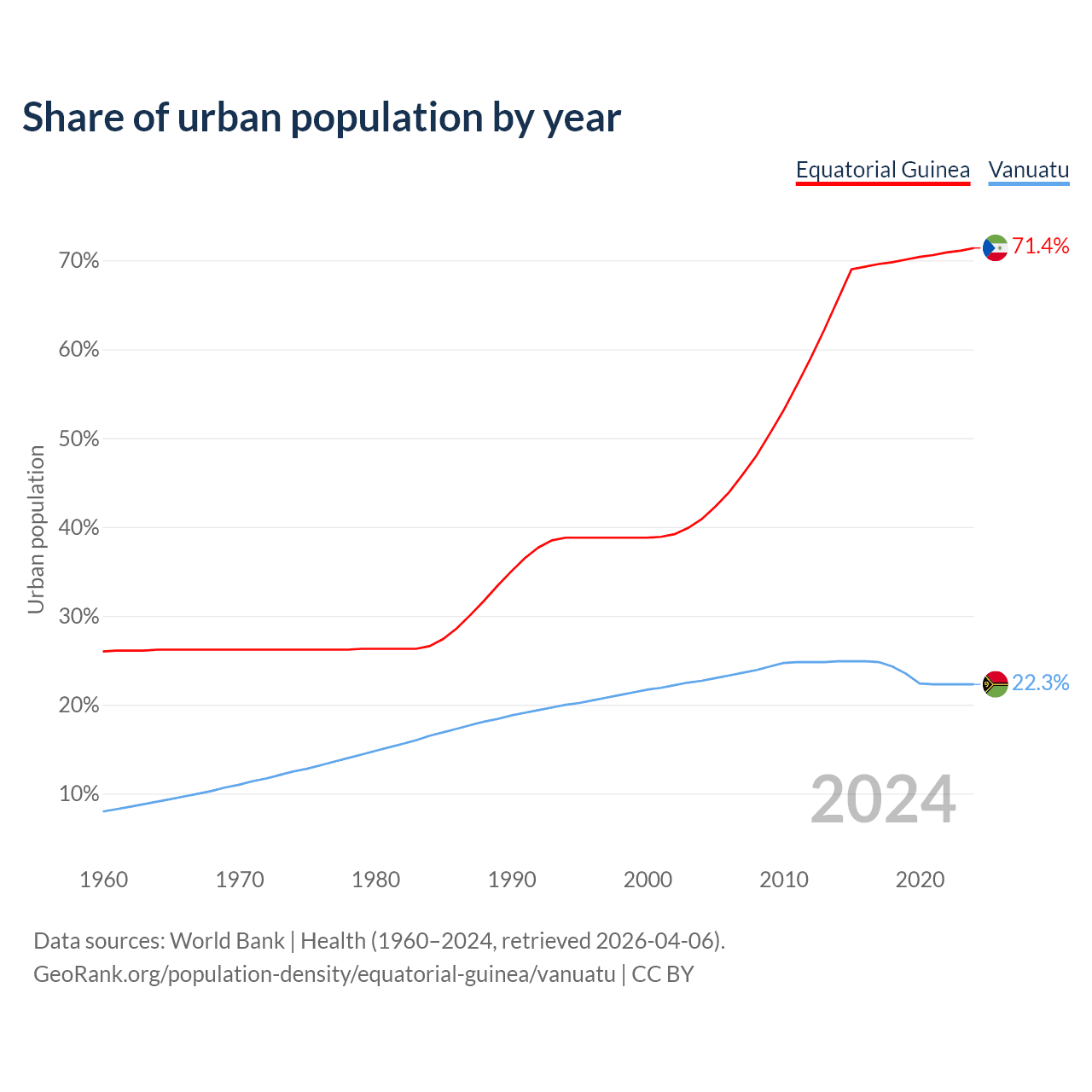From 2004 to 2024, the share of urban population changed from 40.9% to 71.4% in Equatorial Guinea and from 22.7% to 22.3% in Vanuatu.
