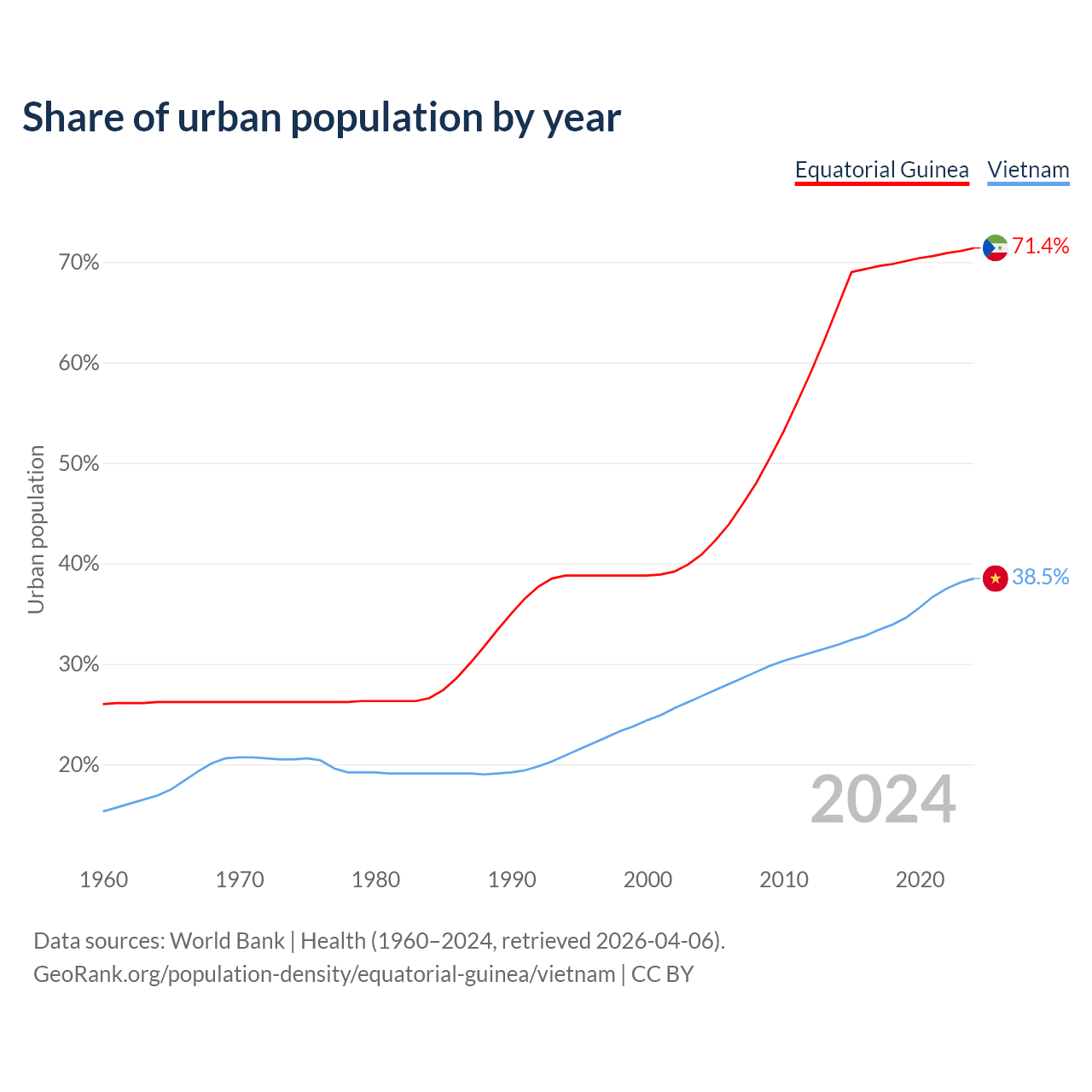 From 2004 to 2024, the share of urban population changed from 40.9% to 71.4% in Equatorial Guinea and from 26.8% to 38.5% in Vietnam.