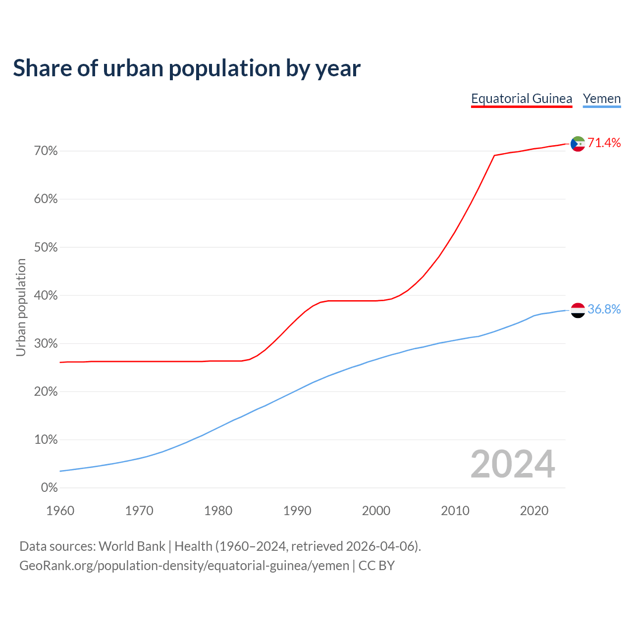 From 2004 to 2024, the share of urban population changed from 40.9% to 71.4% in Equatorial Guinea and from 28.5% to 36.8% in Yemen.