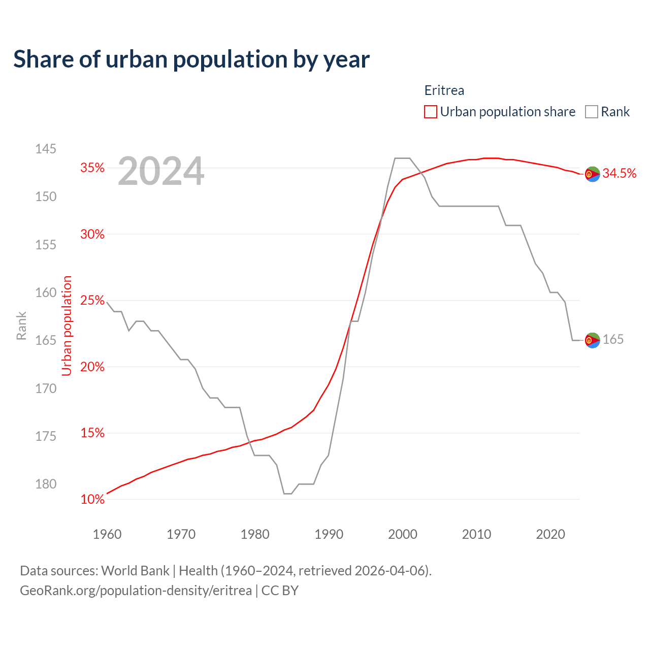 This chart shows the share of urban population in Eritrea from 1960 to 2024: 10.4% lived in urban areas in 1960, 34.1% in 2000, and 34.5% in 2024.