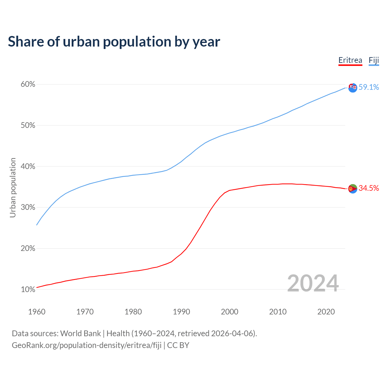 From 2004 to 2024, the share of urban population changed from 34.9% to 34.5% in Eritrea and from 49.5% to 59.1% in Fiji.