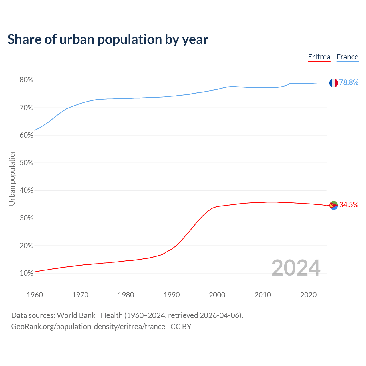 From 2004 to 2024, the share of urban population changed from 34.9% to 34.5% in Eritrea and from 77.5% to 78.8% in France.