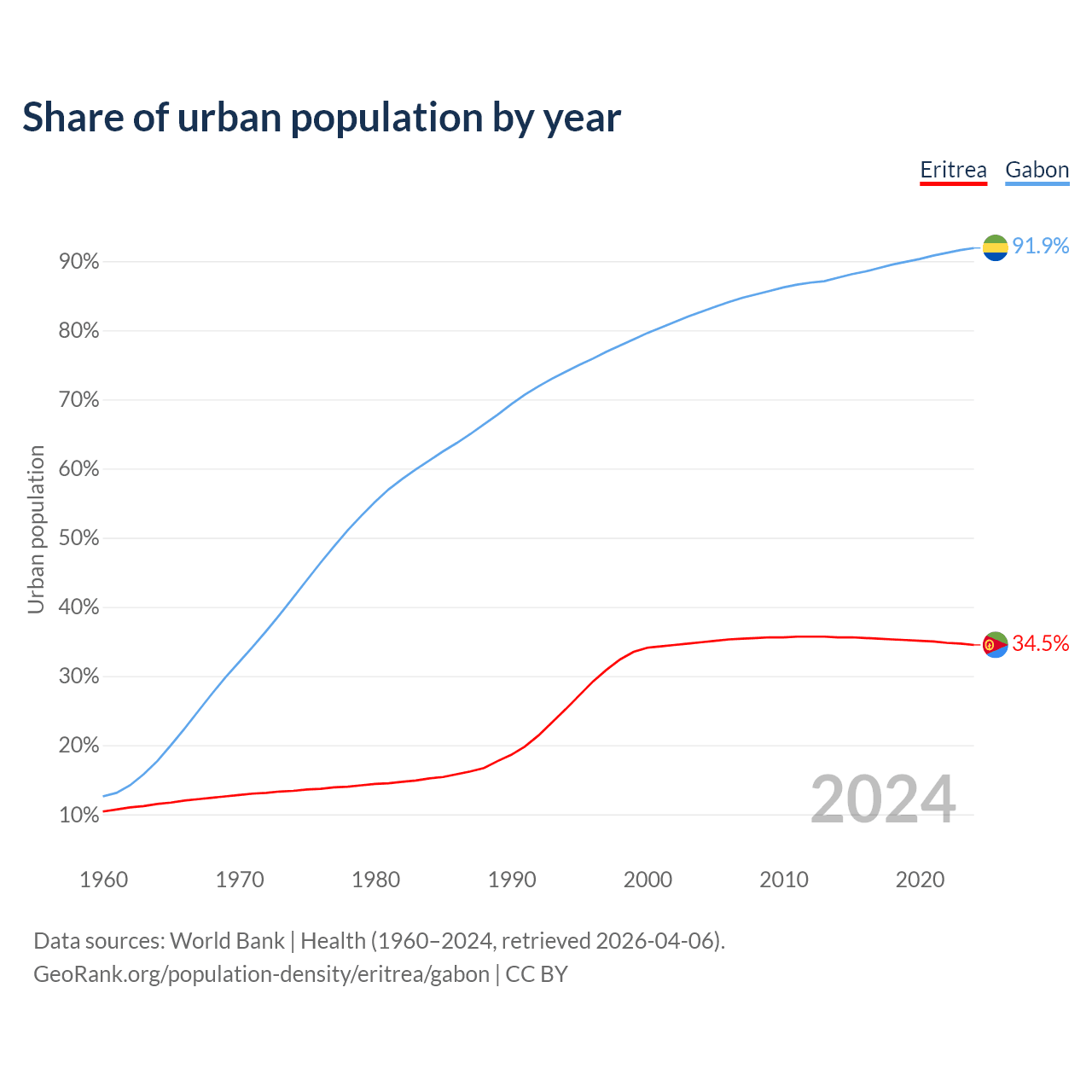 From 2006 to 2026, population density in Eritrea increased by 35.9%, compared to a 75.6% growth in Gabon.