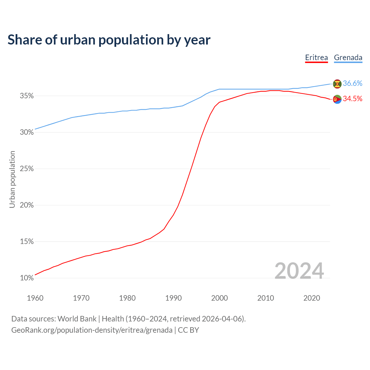 From 2004 to 2024, the share of urban population changed from 34.9% to 34.5% in Eritrea and from 35.9% to 36.6% in Grenada.