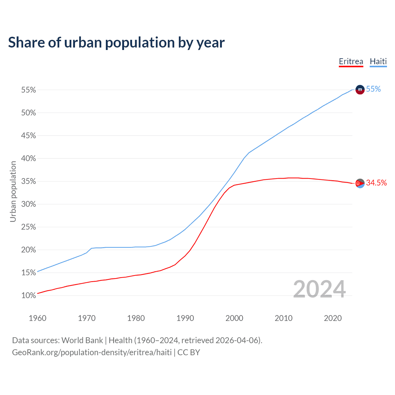 From 2004 to 2024, the share of urban population changed from 34.9% to 34.5% in Eritrea and from 41.9% to 55% in Haiti.