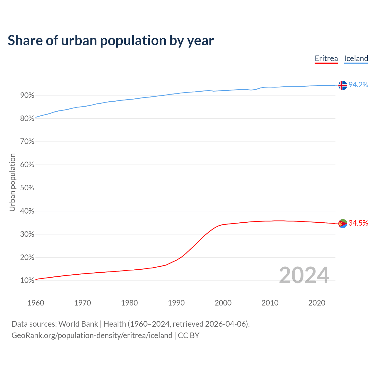 From 2004 to 2024, the share of urban population changed from 34.9% to 34.5% in Eritrea and from 92.4% to 94.2% in Iceland.