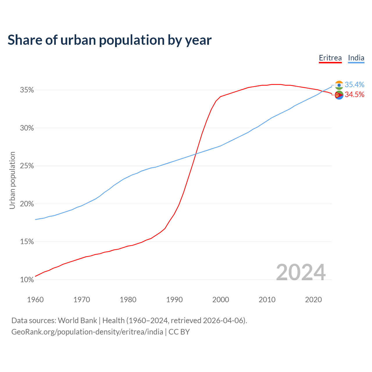 From 2004 to 2024, the share of urban population changed from 34.9% to 34.5% in Eritrea and from 28.8% to 35.4% in India.