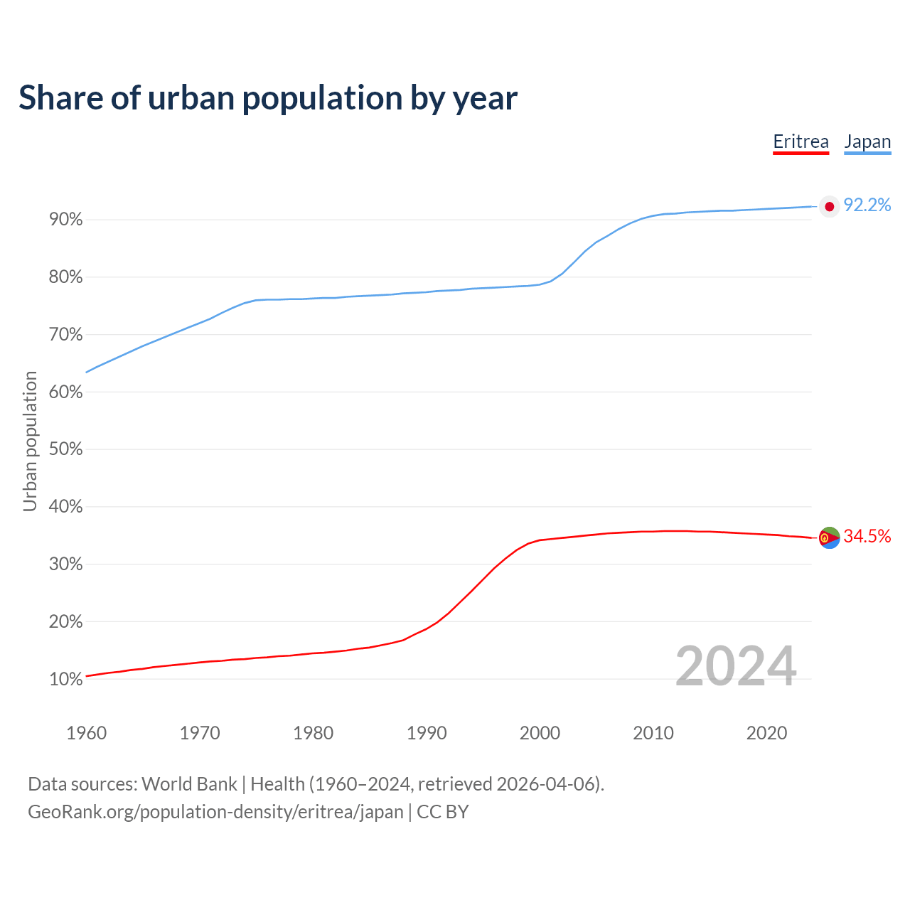 From 2004 to 2024, the share of urban population changed from 34.9% to 34.5% in Eritrea and from 84.4% to 92.2% in Japan.