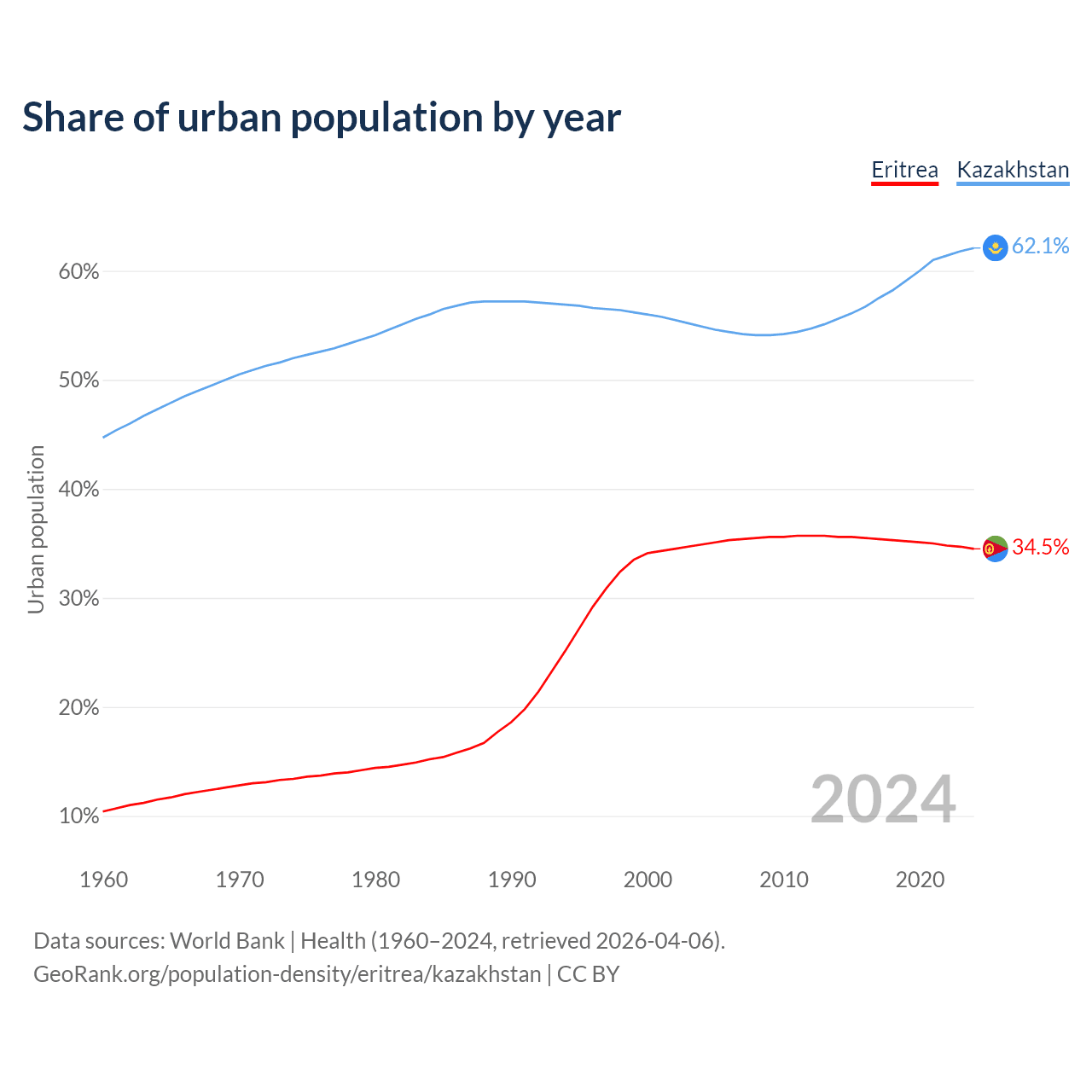 From 2004 to 2024, the share of urban population changed from 34.9% to 34.5% in Eritrea and from 54.9% to 62.1% in Kazakhstan.