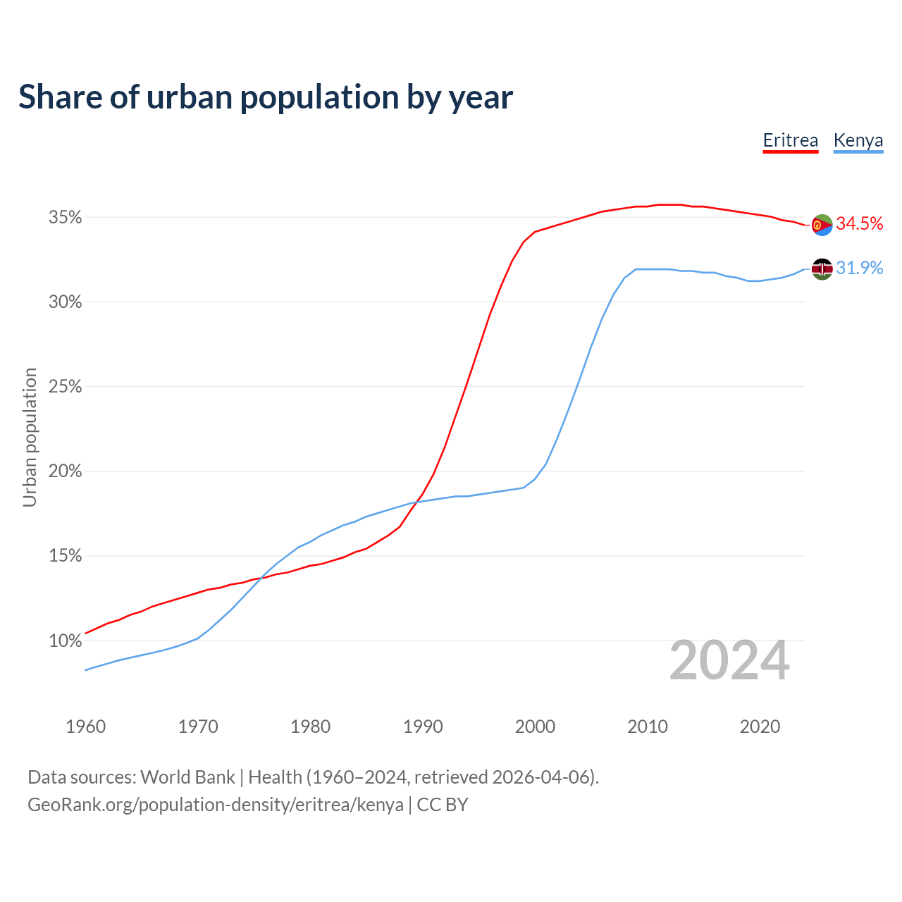 From 2004 to 2024, the share of urban population changed from 34.9% to 34.5% in Eritrea and from 25.4% to 31.9% in Kenya.
