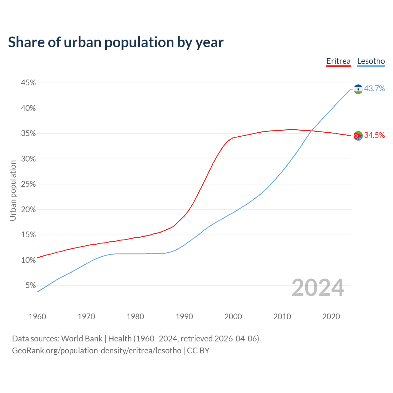 From 2004 to 2024, the share of urban population changed from 34.9% to 34.5% in Eritrea and from 21.8% to 43.7% in Lesotho.