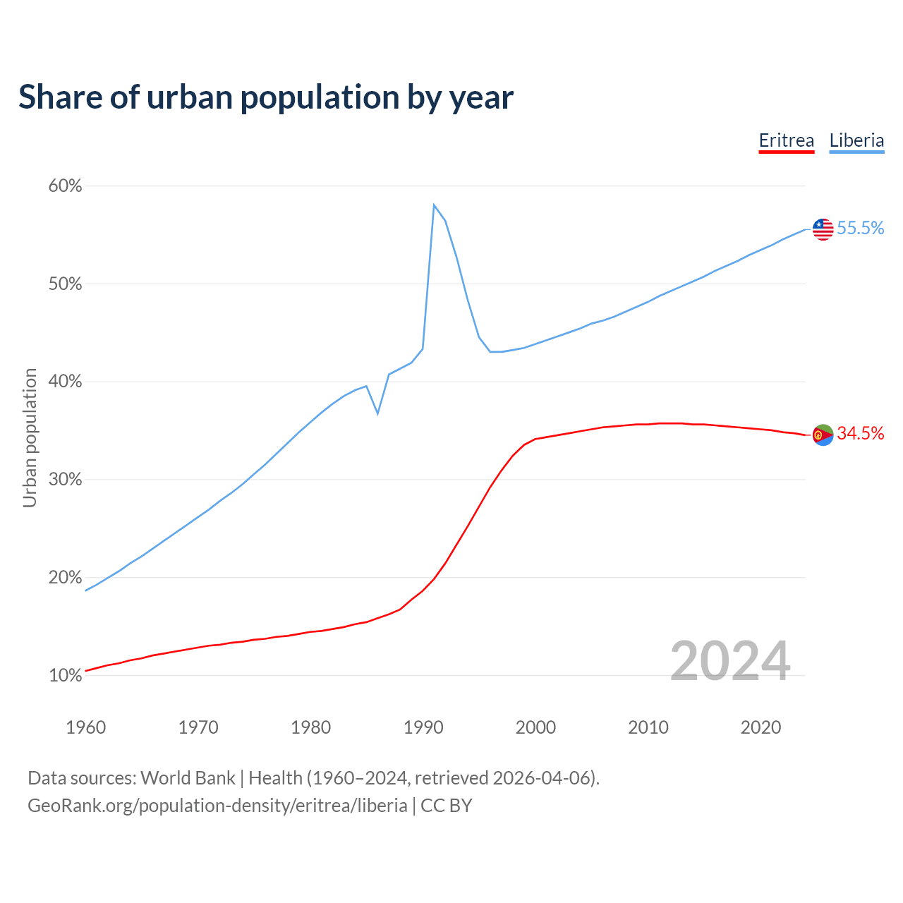 From 2004 to 2024, the share of urban population changed from 34.9% to 34.5% in Eritrea and from 45.4% to 55.5% in Liberia.
