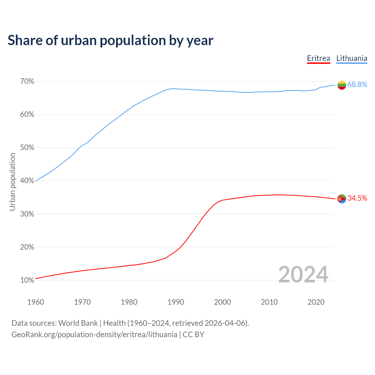 From 2004 to 2024, the share of urban population changed from 34.9% to 34.5% in Eritrea and from 66.6% to 68.8% in Lithuania.