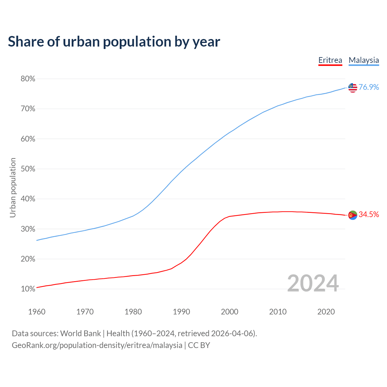 From 2004 to 2024, the share of urban population changed from 34.9% to 34.5% in Eritrea and from 66.1% to 76.9% in Malaysia.