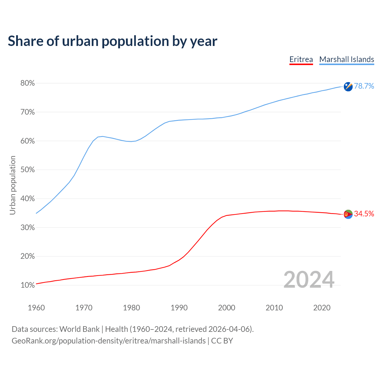 From 2004 to 2024, the share of urban population changed from 34.9% to 34.5% in Eritrea and from 70.1% to 78.7% in the Marshall Islands.