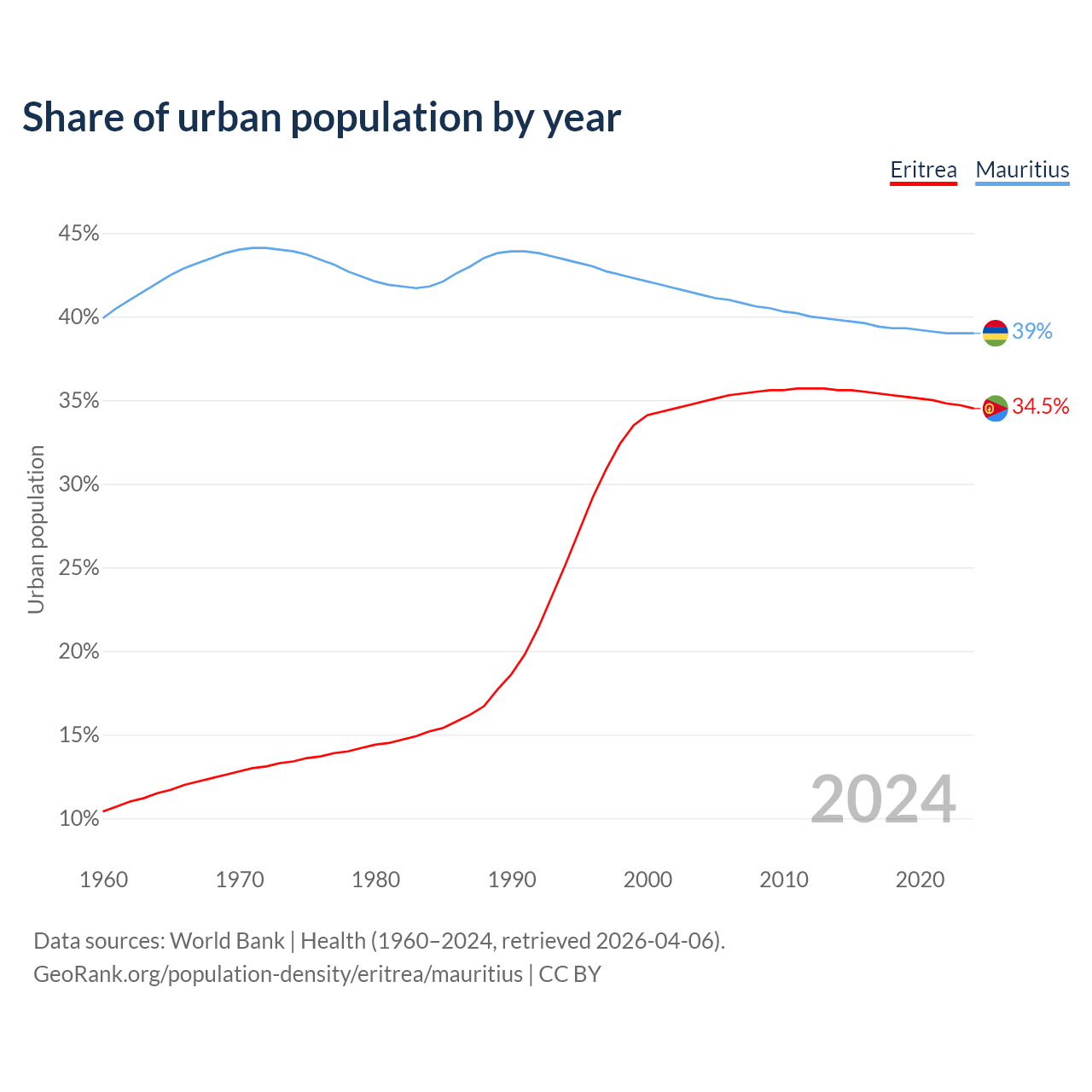From 2004 to 2024, the share of urban population changed from 34.9% to 34.5% in Eritrea and from 41.3% to 39% in Mauritius.