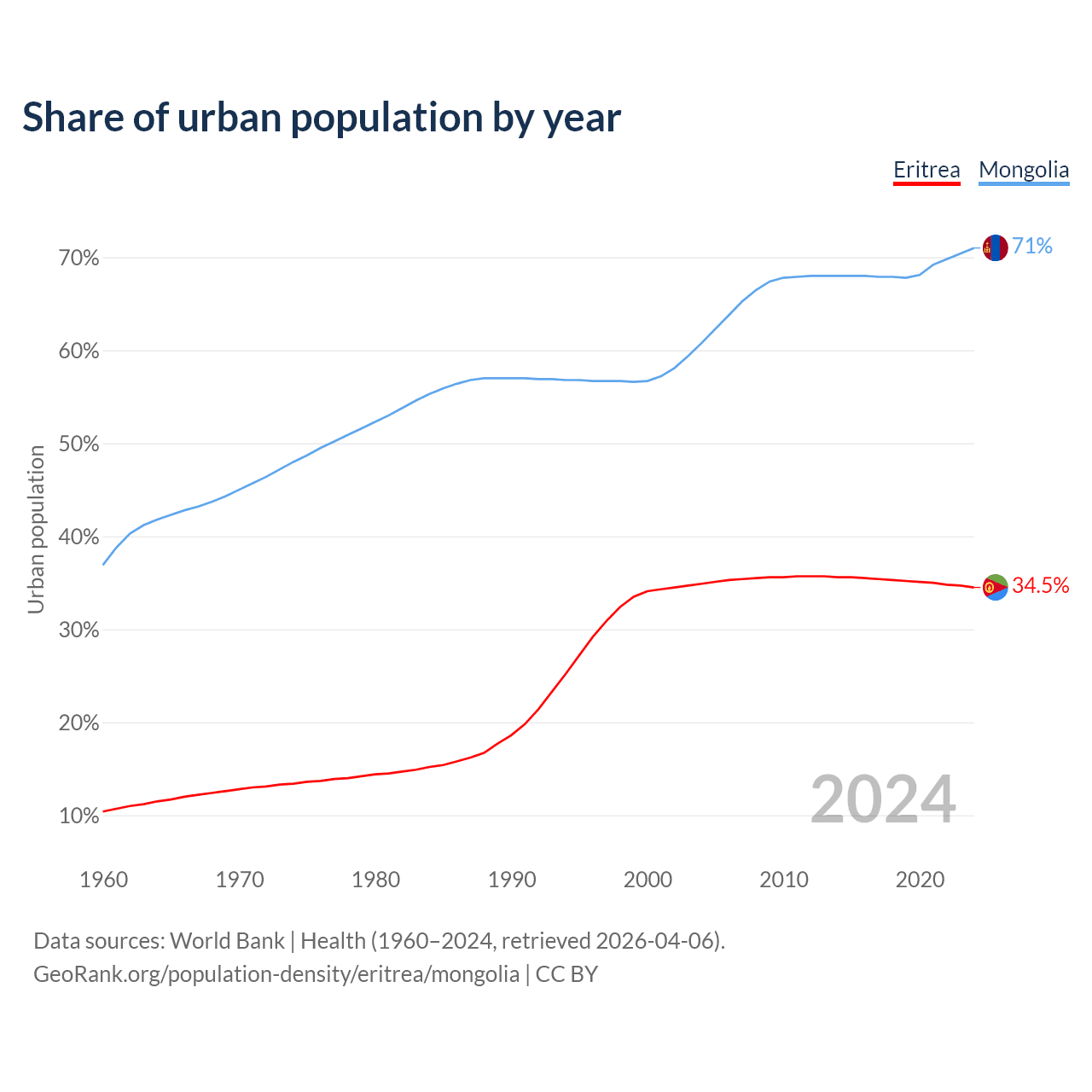From 2004 to 2024, the share of urban population changed from 34.9% to 34.5% in Eritrea and from 60.8% to 71% in Mongolia.
