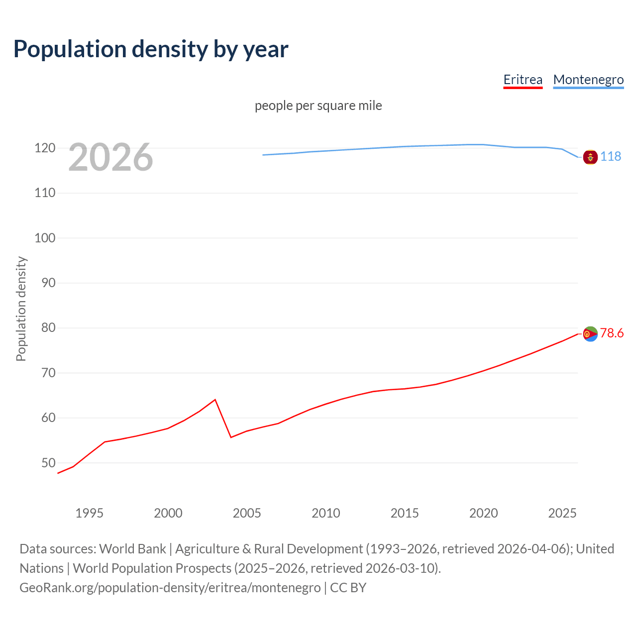 From 2006 to 2026, population density in Eritrea increased by 35.9%, compared to a 0.44% decline in Montenegro.