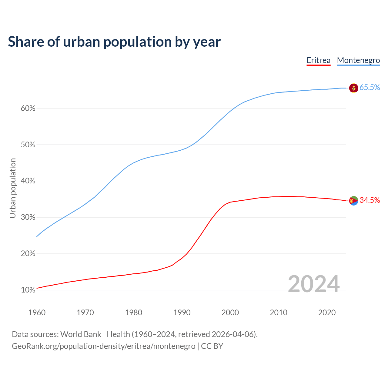 From 2004 to 2024, the share of urban population changed from 34.9% to 34.5% in Eritrea and from 62.2% to 65.5% in Montenegro.