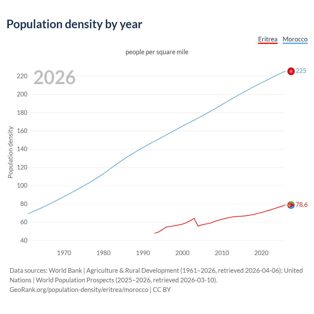 From 2006 to 2026, population density in Eritrea increased by 35.9%, compared to a 26% growth in Morocco.