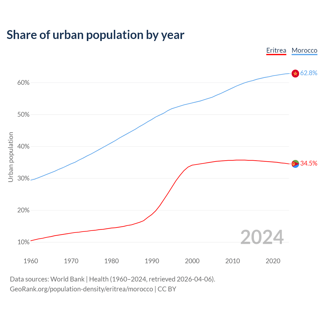 From 2004 to 2024, the share of urban population changed from 34.9% to 34.5% in Eritrea and from 55% to 62.8% in Morocco.