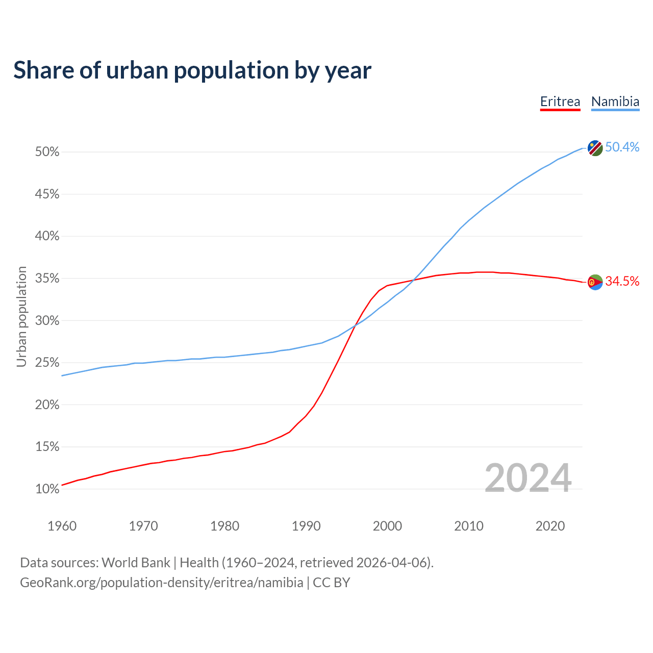 From 2004 to 2024, the share of urban population changed from 34.9% to 34.5% in Eritrea and from 35.5% to 50.4% in Namibia.