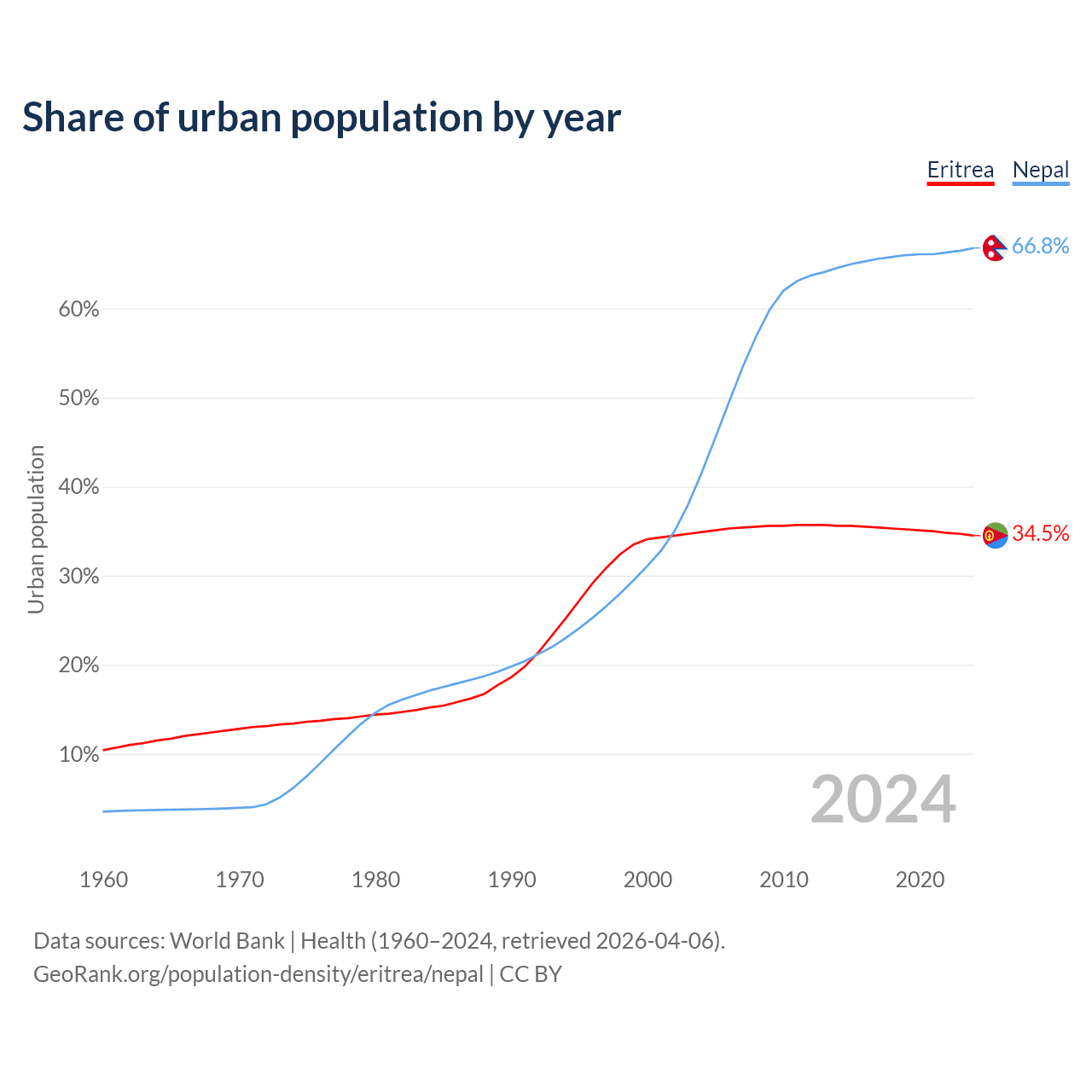 From 2004 to 2024, the share of urban population changed from 34.9% to 34.5% in Eritrea and from 41.6% to 66.8% in Nepal.