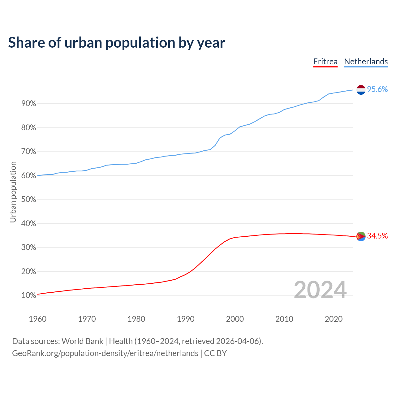 From 2004 to 2024, the share of urban population changed from 34.9% to 34.5% in Eritrea and from 82.3% to 95.6% in the Netherlands.