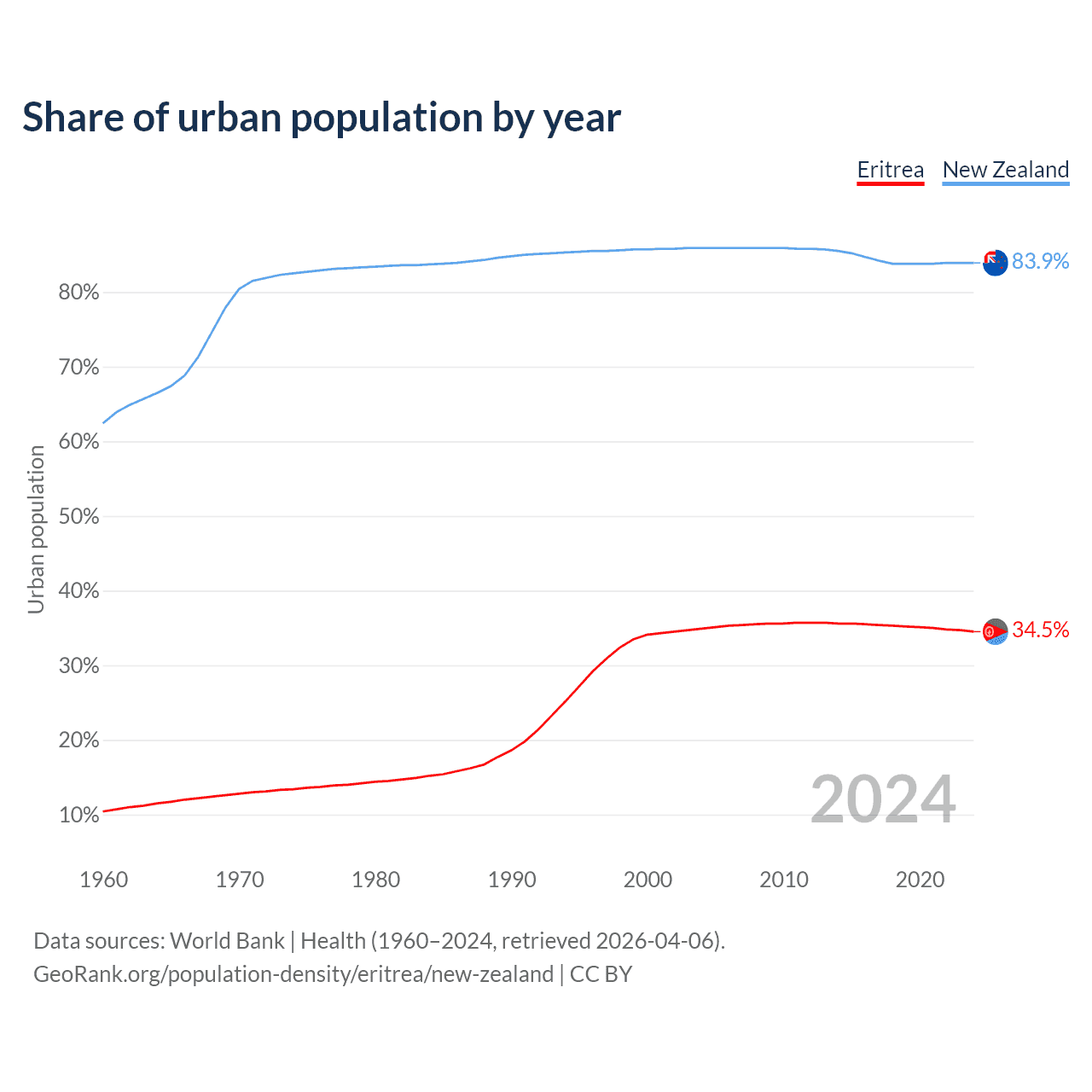 From 2004 to 2024, the share of urban population changed from 34.9% to 34.5% in Eritrea and from 85.9% to 83.9% in New Zealand.