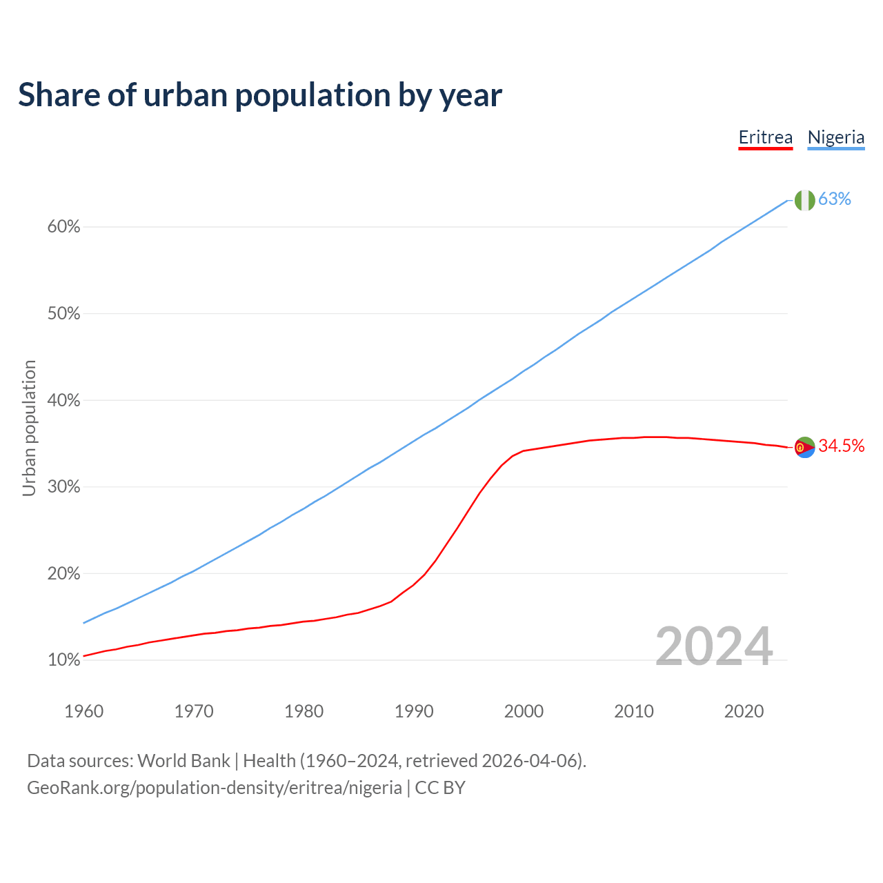 From 2004 to 2024, the share of urban population changed from 34.9% to 34.5% in Eritrea and from 46.7% to 63% in Nigeria.