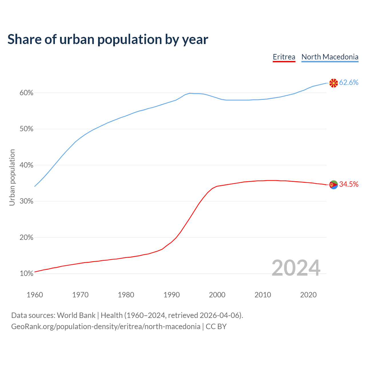 From 2004 to 2024, the share of urban population changed from 34.9% to 34.5% in Eritrea and from 57.9% to 62.6% in North Macedonia.