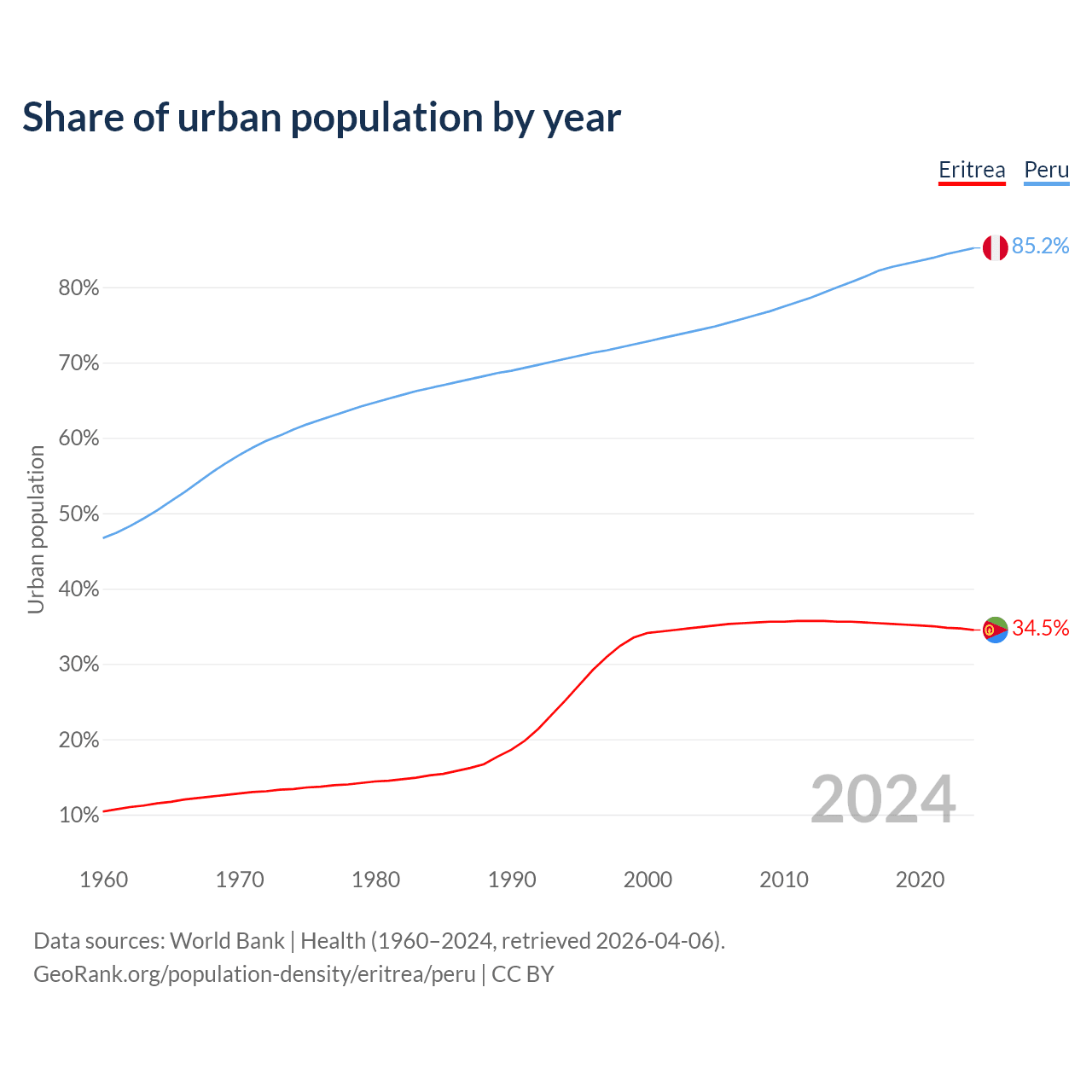 From 2004 to 2024, the share of urban population changed from 34.9% to 34.5% in Eritrea and from 74.4% to 85.2% in Peru.