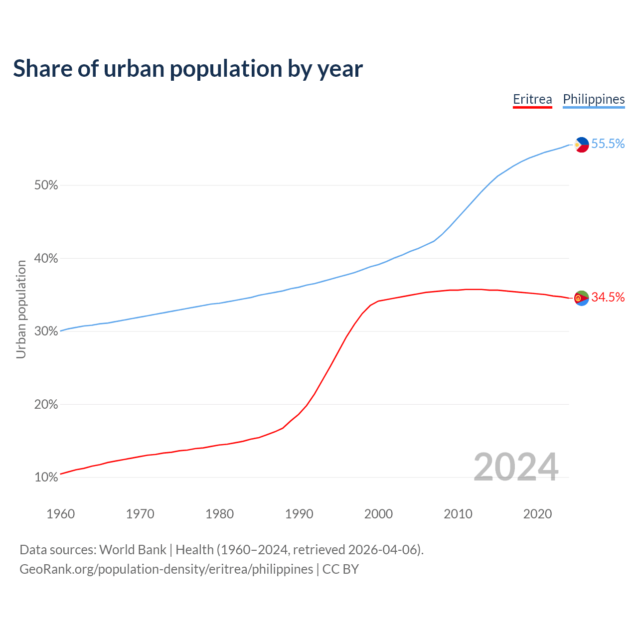 From 2004 to 2024, the share of urban population changed from 34.9% to 34.5% in Eritrea and from 40.9% to 55.5% in the Philippines.