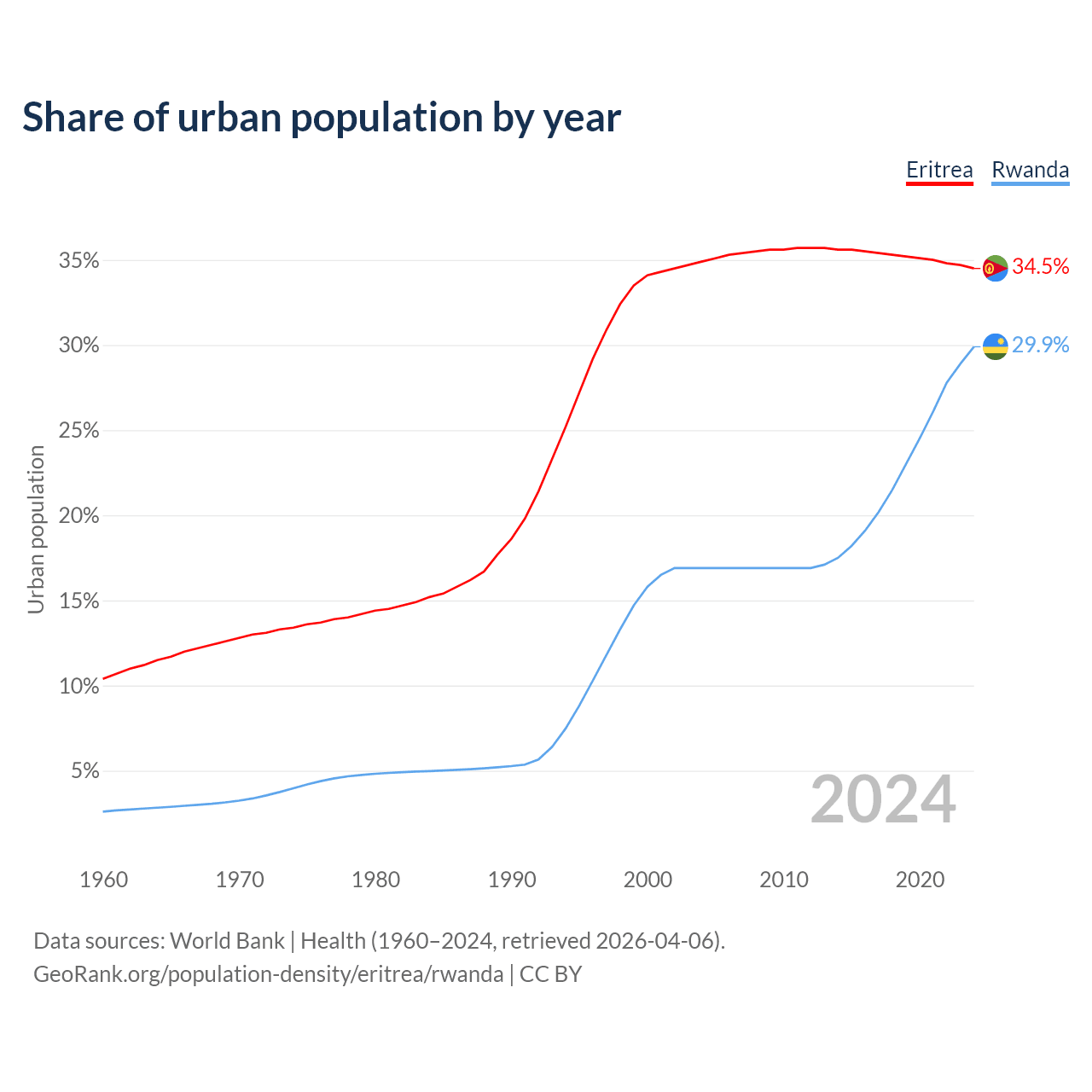 From 2004 to 2024, the share of urban population changed from 34.9% to 34.5% in Eritrea and from 16.9% to 29.9% in Rwanda.