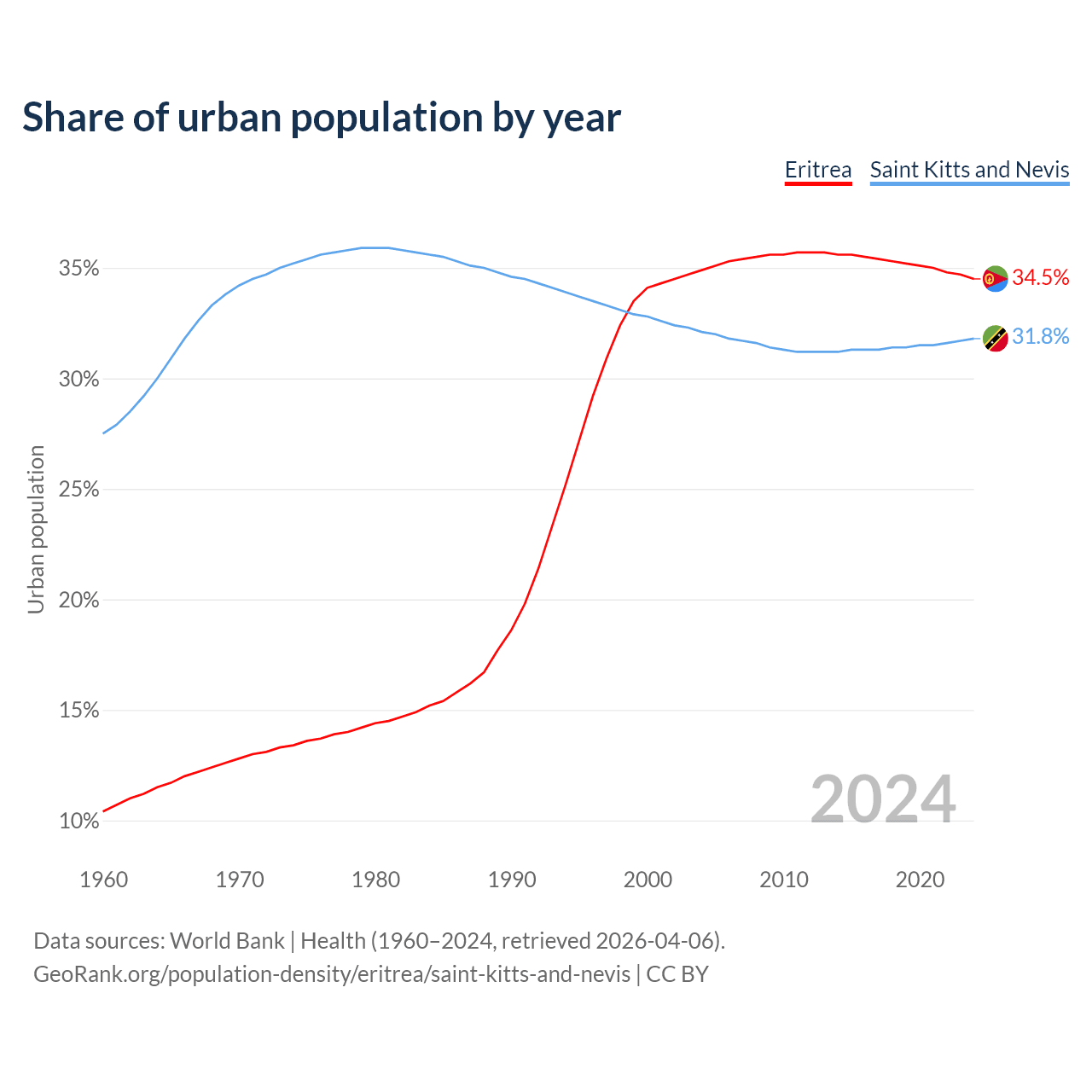 From 2004 to 2024, the share of urban population changed from 34.9% to 34.5% in Eritrea and from 32.1% to 31.8% in Saint Kitts and Nevis.