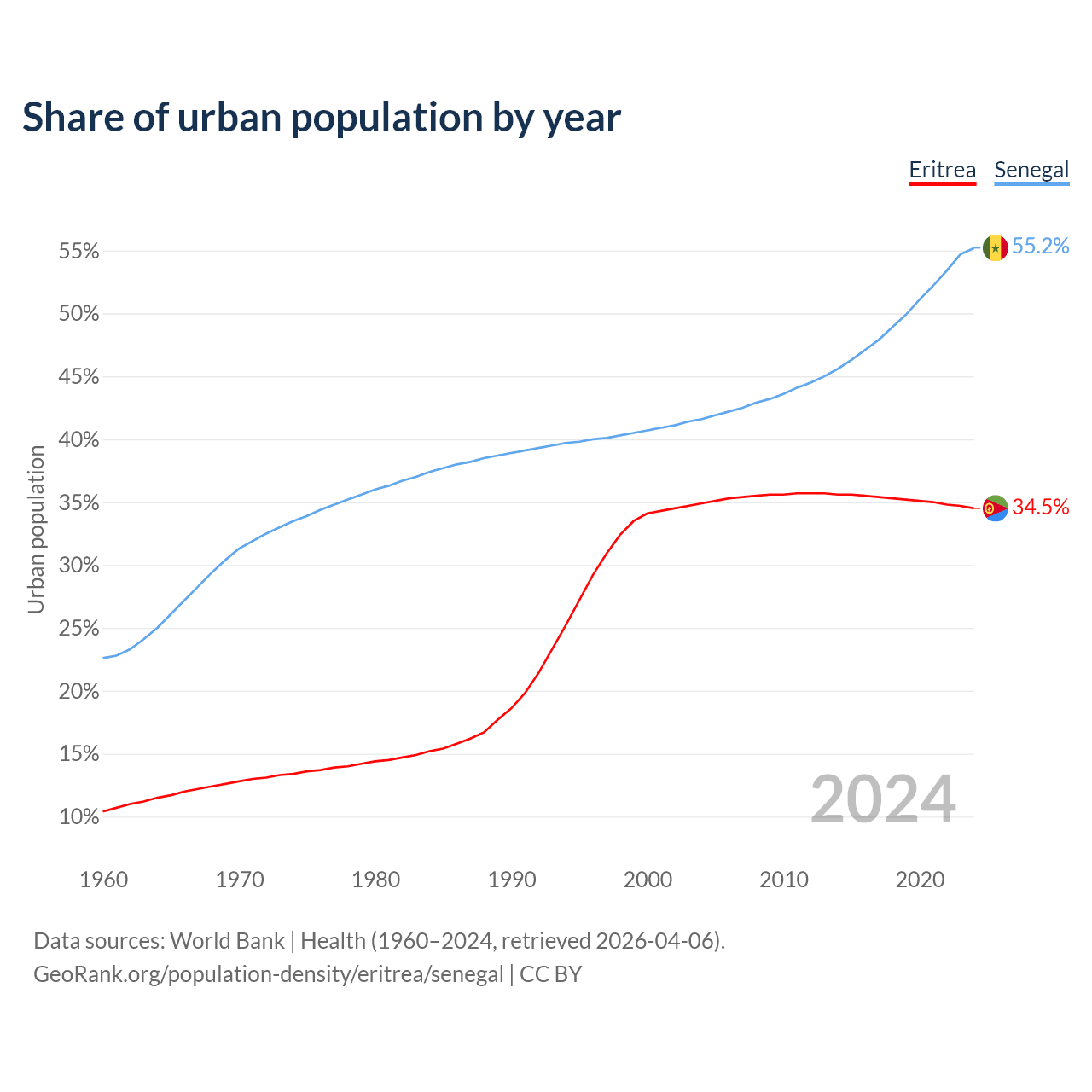 From 2004 to 2024, the share of urban population changed from 34.9% to 34.5% in Eritrea and from 41.6% to 55.2% in Senegal.