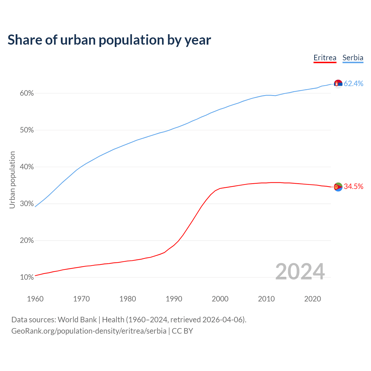 From 2006 to 2026, population density in Eritrea increased by 35.9%, compared to a 8.86% decline in Serbia.