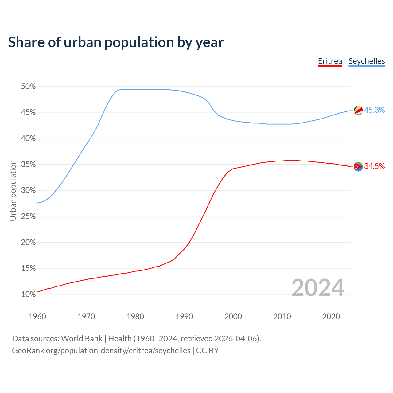 From 2004 to 2024, the share of urban population changed from 34.9% to 34.5% in Eritrea and from 42.9% to 45.3% in the Seychelles.
