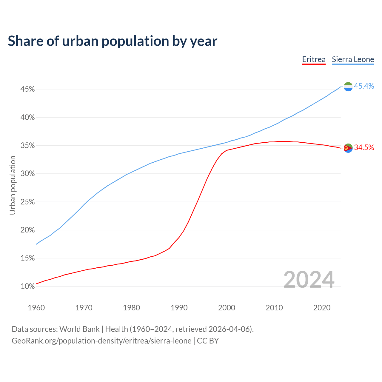 From 2004 to 2024, the share of urban population changed from 34.9% to 34.5% in Eritrea and from 36.5% to 45.4% in Sierra Leone.