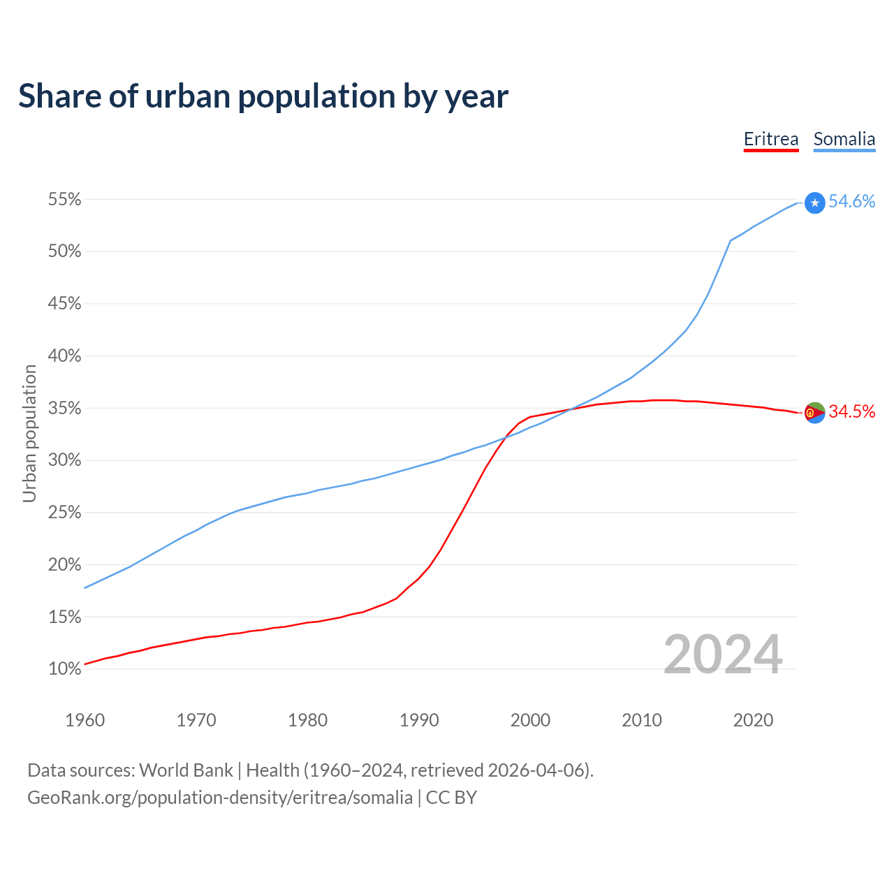 From 2004 to 2024, the share of urban population changed from 34.9% to 34.5% in Eritrea and from 35% to 54.6% in Somalia.