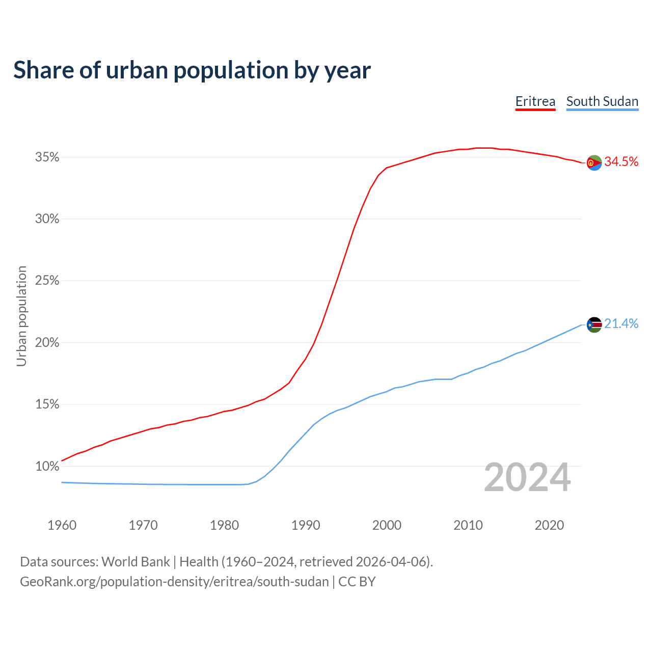From 2004 to 2024, the share of urban population changed from 34.9% to 34.5% in Eritrea and from 16.8% to 21.4% in South Sudan.