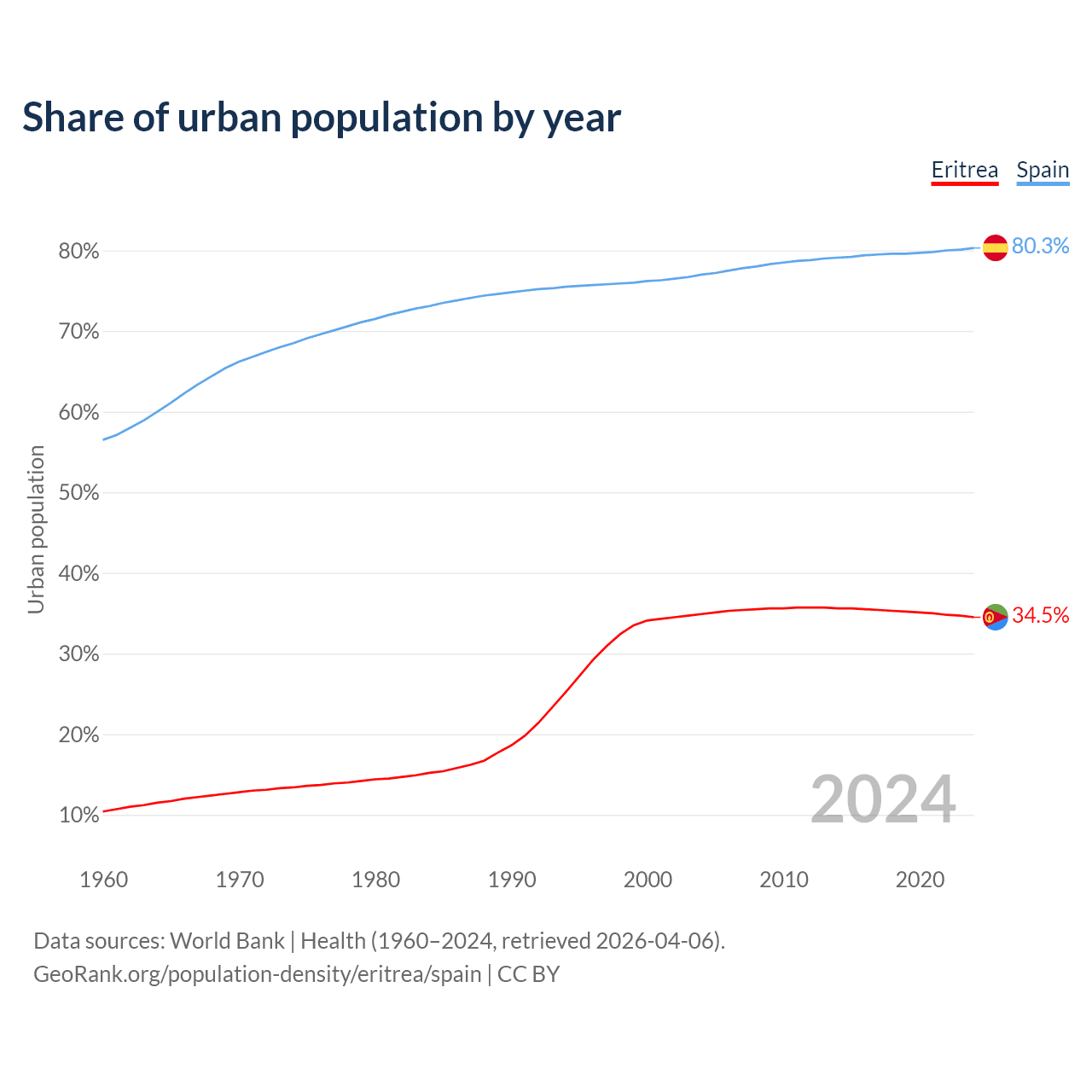 From 2004 to 2024, the share of urban population changed from 34.9% to 34.5% in Eritrea and from 77% to 80.3% in Spain.