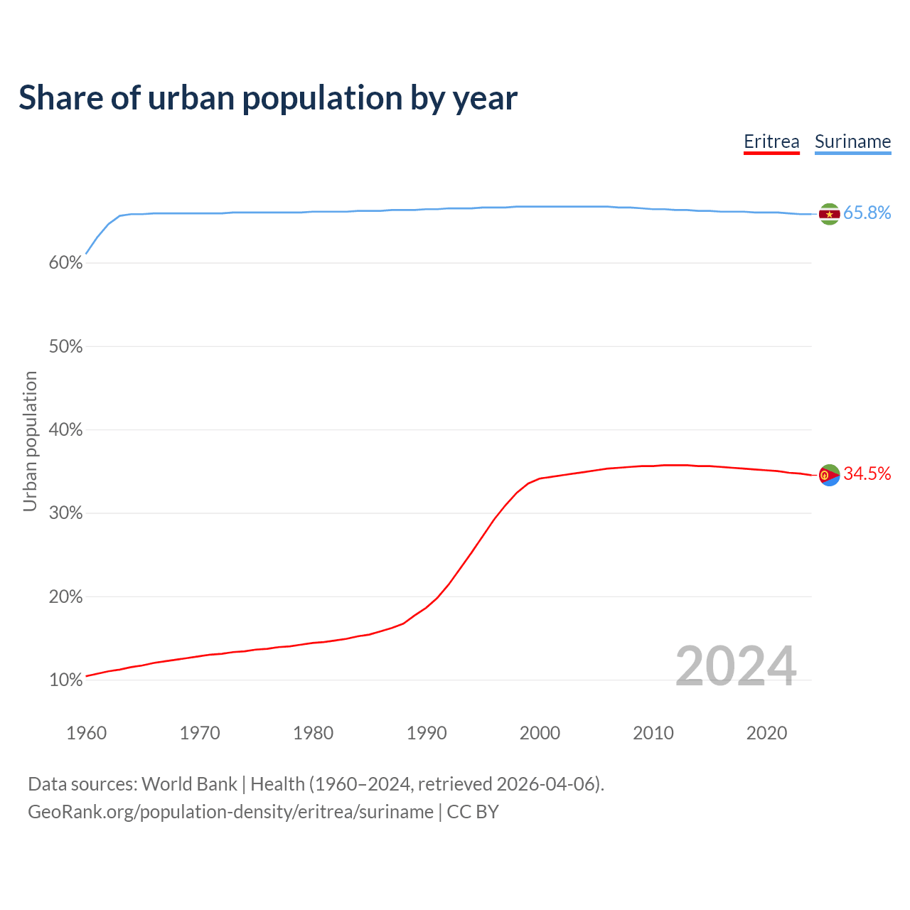 From 2004 to 2024, the share of urban population changed from 34.9% to 34.5% in Eritrea and from 66.7% to 65.8% in Suriname.