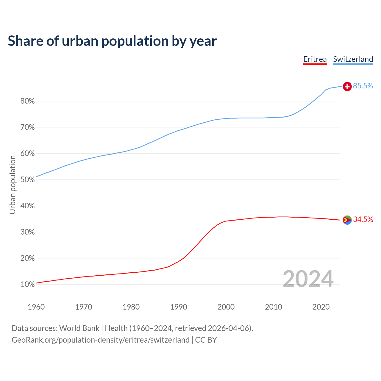 From 2004 to 2024, the share of urban population changed from 34.9% to 34.5% in Eritrea and from 73.5% to 85.5% in Switzerland.