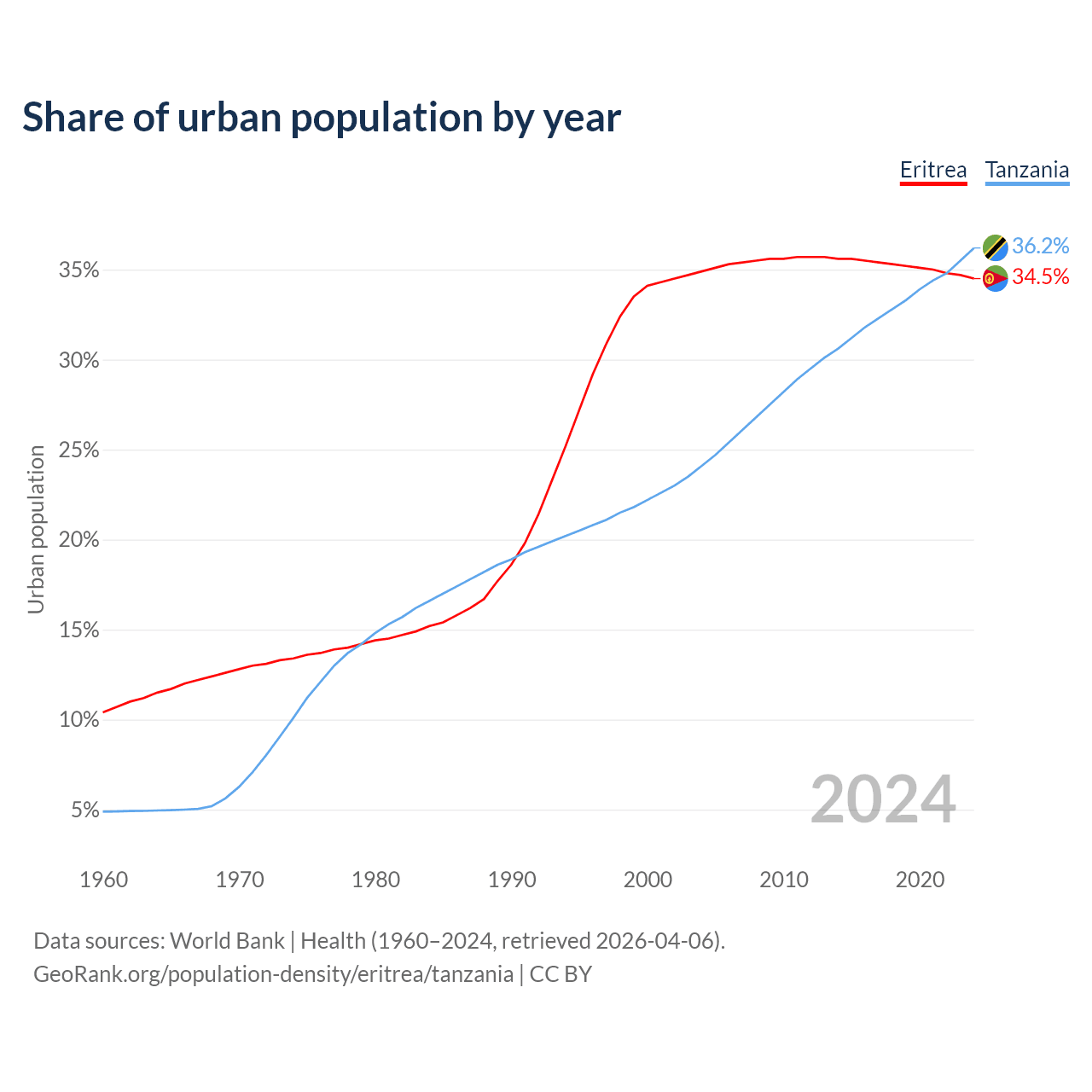 From 2004 to 2024, the share of urban population changed from 34.9% to 34.5% in Eritrea and from 24.1% to 36.2% in Tanzania.