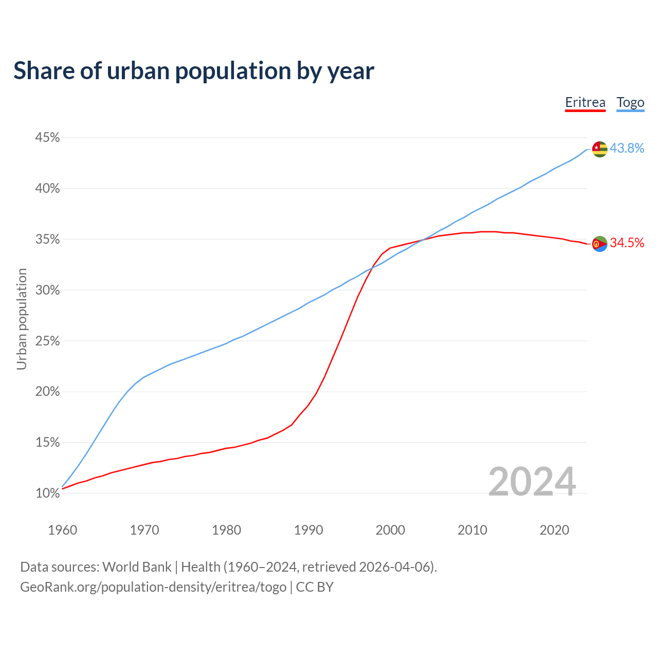 From 2004 to 2024, the share of urban population changed from 34.9% to 34.5% in Eritrea and from 34.9% to 43.8% in Togo.