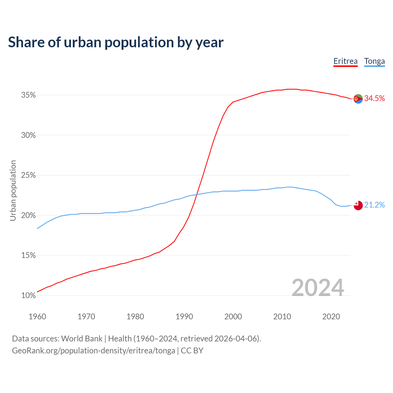 From 2004 to 2024, the share of urban population changed from 34.9% to 34.5% in Eritrea and from 23.1% to 21.2% in Tonga.