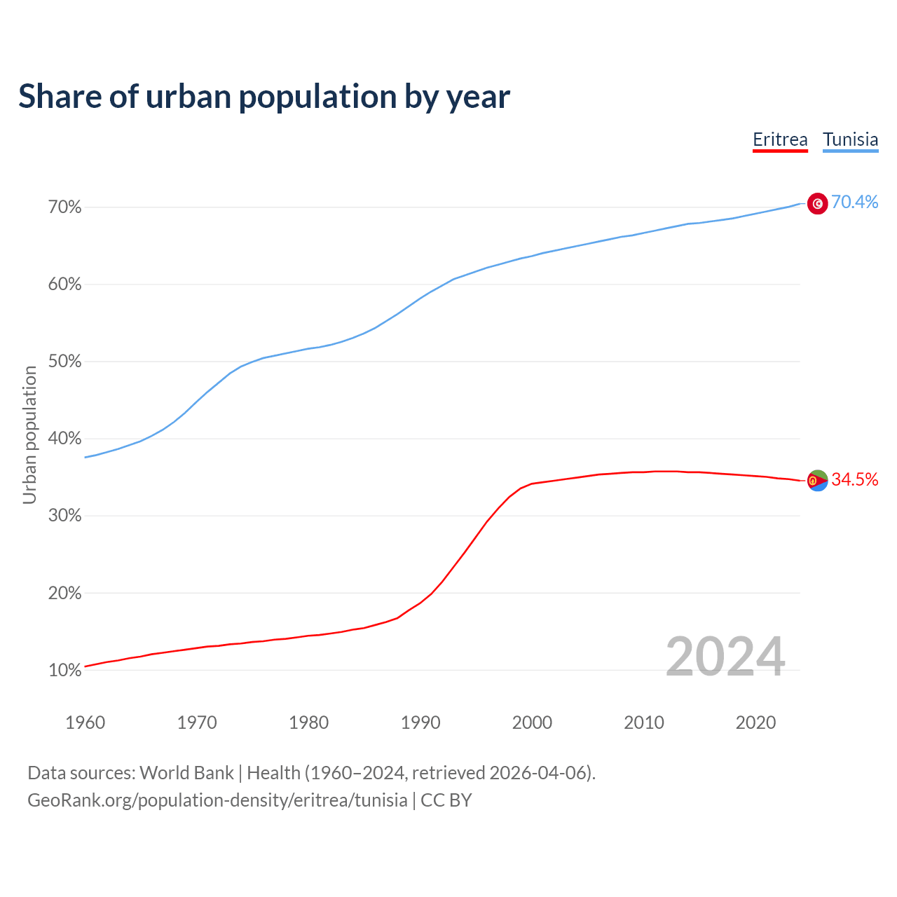 From 2004 to 2024, the share of urban population changed from 34.9% to 34.5% in Eritrea and from 64.9% to 70.4% in Tunisia.